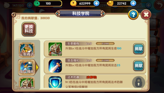 科技里面就是类似军团捐献,可以解锁军团里的功能,这个需要大家一起努力,每日捐献是有限的,达到一定值数才能开启某个功能。