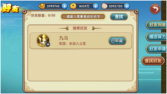 点击查找好友,可以出现好友推荐好友,点击申请可以向该玩家发出好友请求,等待对方确认后即可互为好友关系