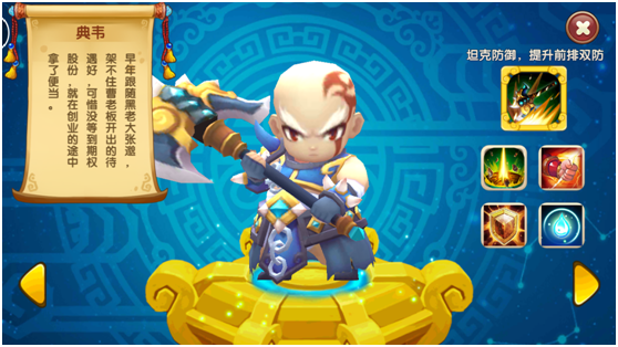 典韦作为一个纯肉型坦克,技能方面带有眩晕效果,有较强的控制及打断能力,团队增益针对前排武将提升双防,增加前排生存能力。属性成长方面,典韦的双防较为均衡,搭配输出型前排有较好的提升。